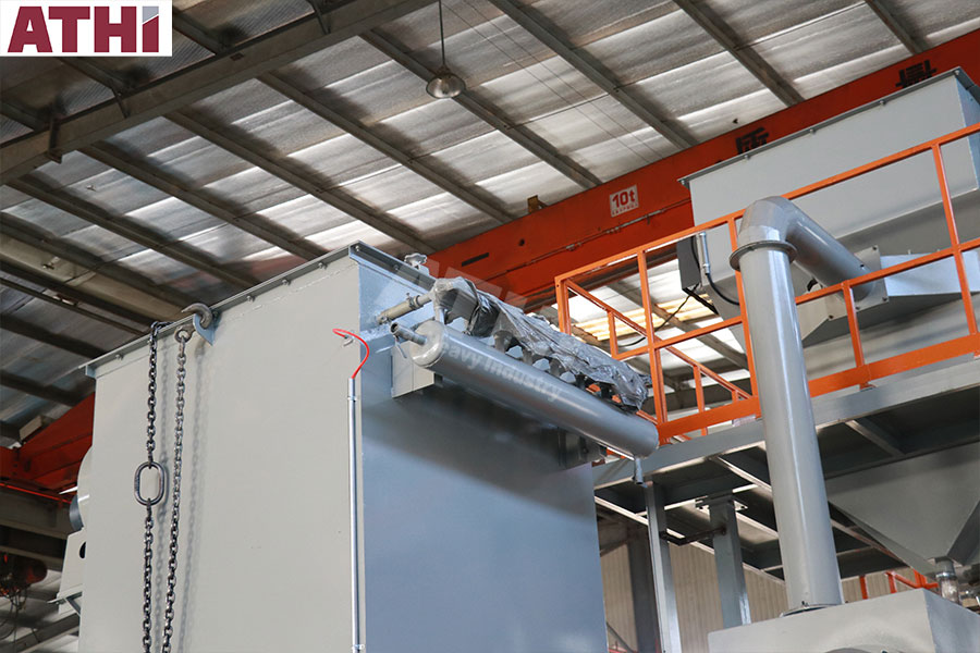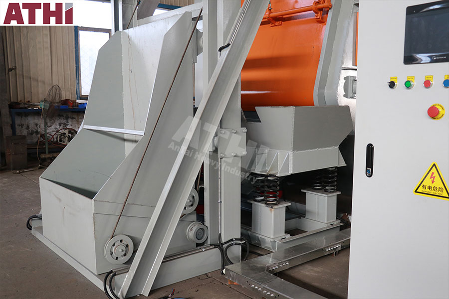 工件通过加料机加入清理室中后,吊门下降,抛丸器启动,工件在被滚筒带动翻转的同时,抛丸器高速抛出的弹丸形成扇形束,均匀地打击在工件表面上,达到清理的目的。抛出的弹丸及砂粒从履带上的小孔,流入底部的螺旋输送器筛网上,经螺旋输送器送入提升机内,由提升机提到分离器中进行分离。含尘气体由风机吸送到除尘器中过滤后,变为清洁空气,排入大气中,布袋上的灰尘经空气反吹落入除尘器底部的集尘箱中,用户可定期清除。废砂由废料管流出,用户可回用。丸砂混合物由回用管回收进入室体,待分离器分离后再回用;干净的弹丸由供丸闸门进入抛丸器抛打工件。